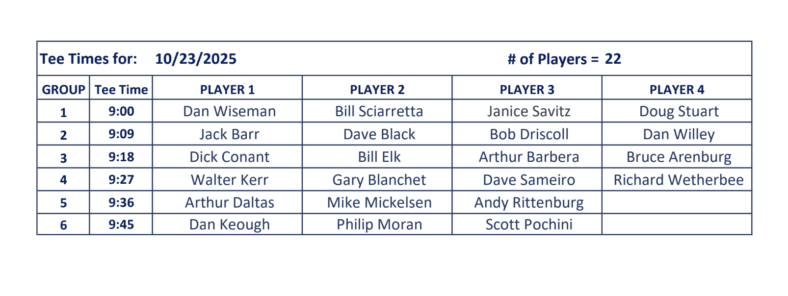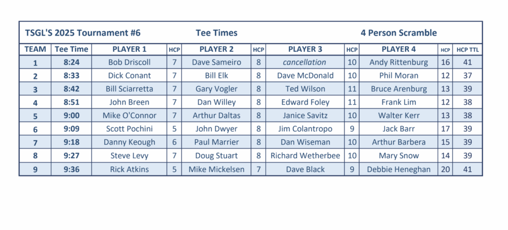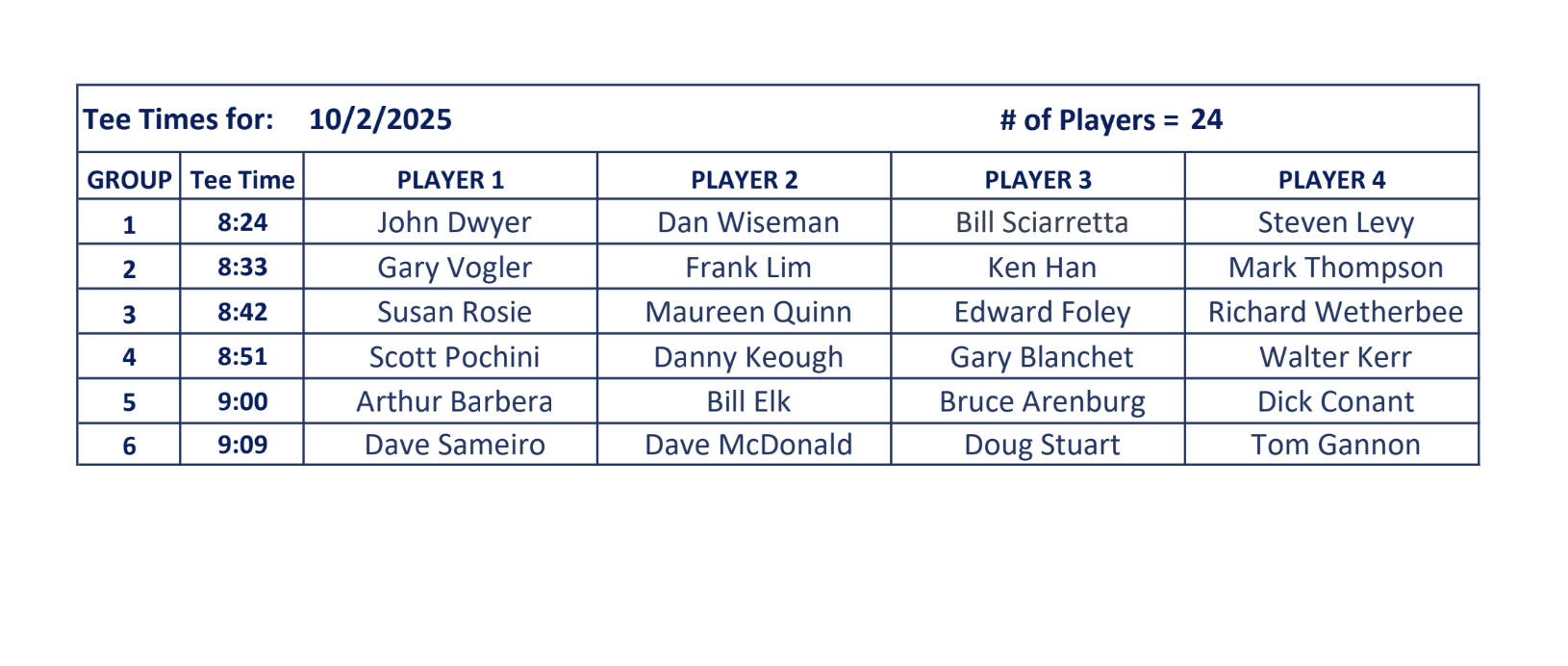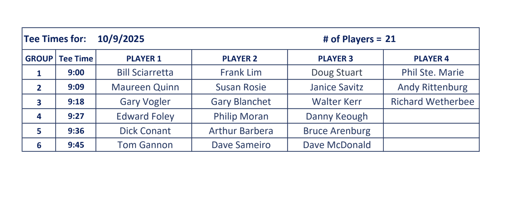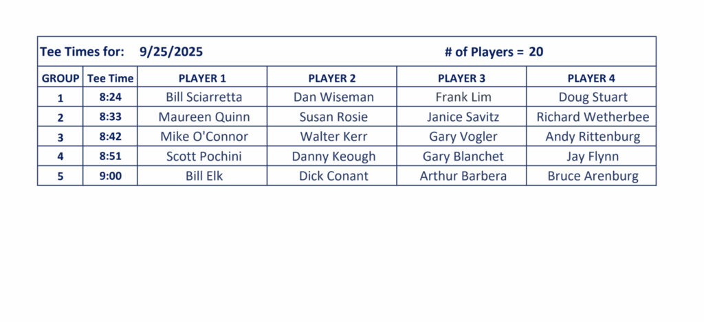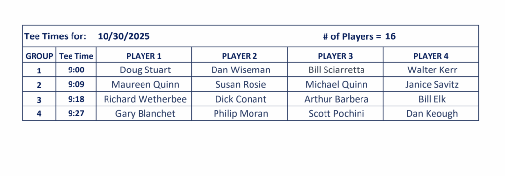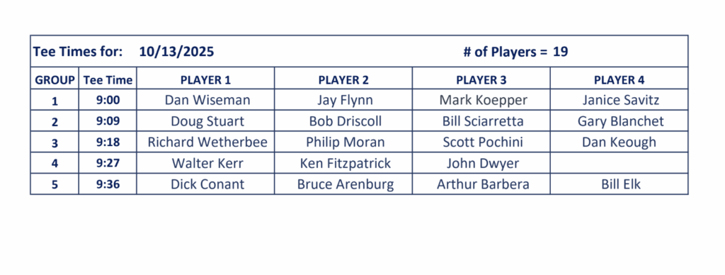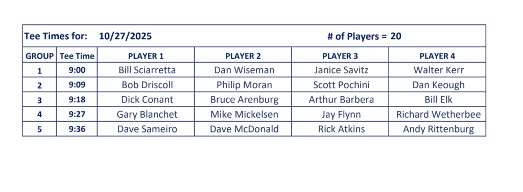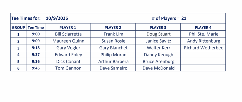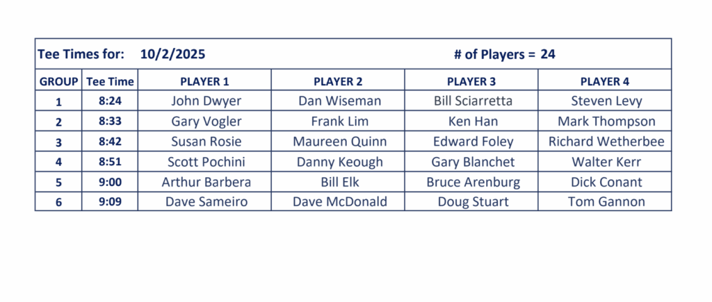 2025-10-06 Tee Times for Oct 6 Tournament 6 – 4 Person Scramble