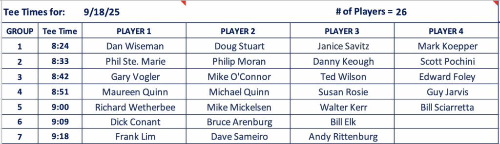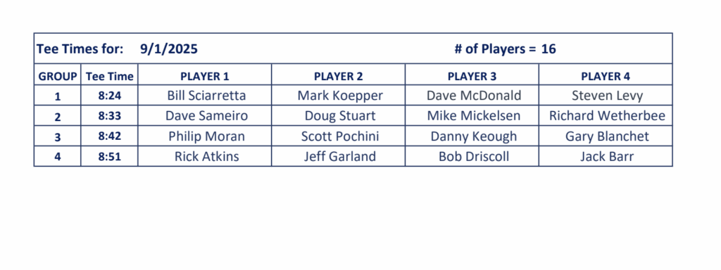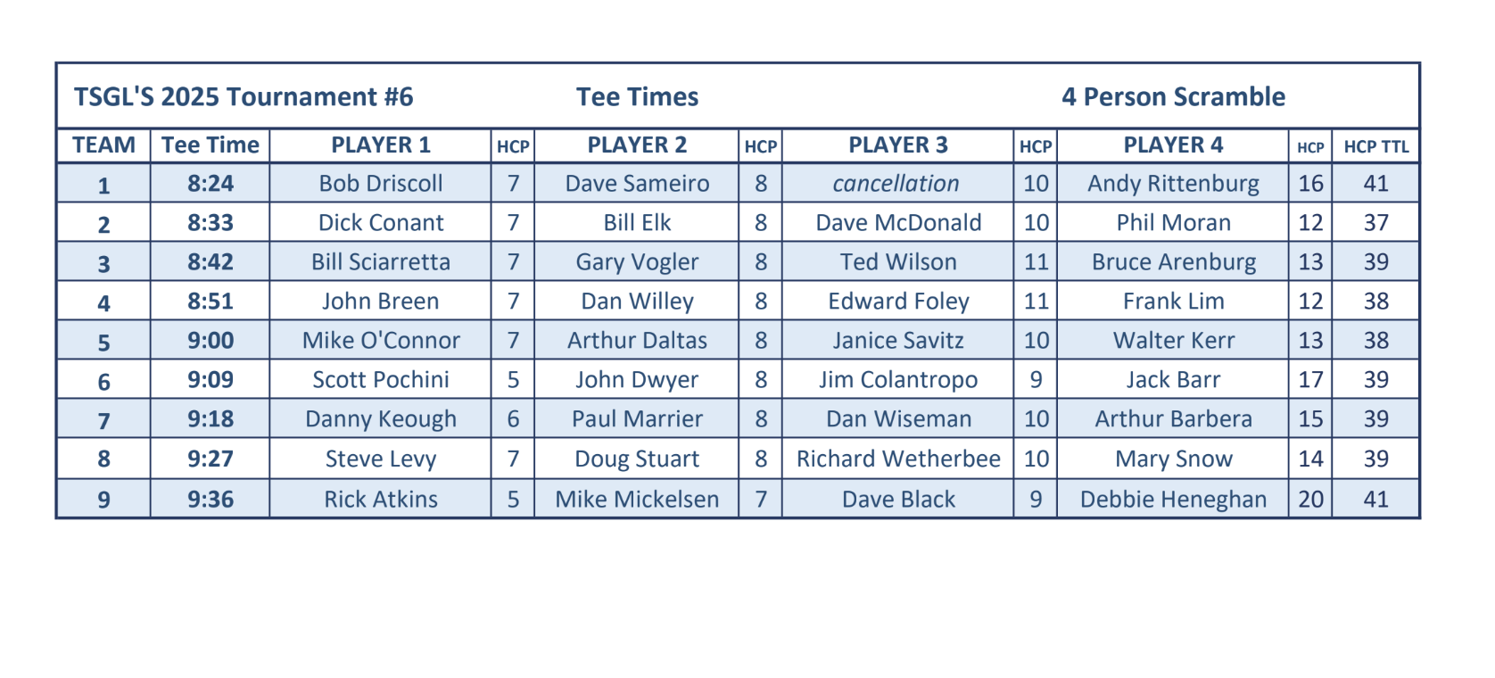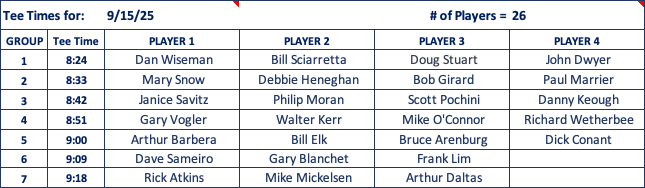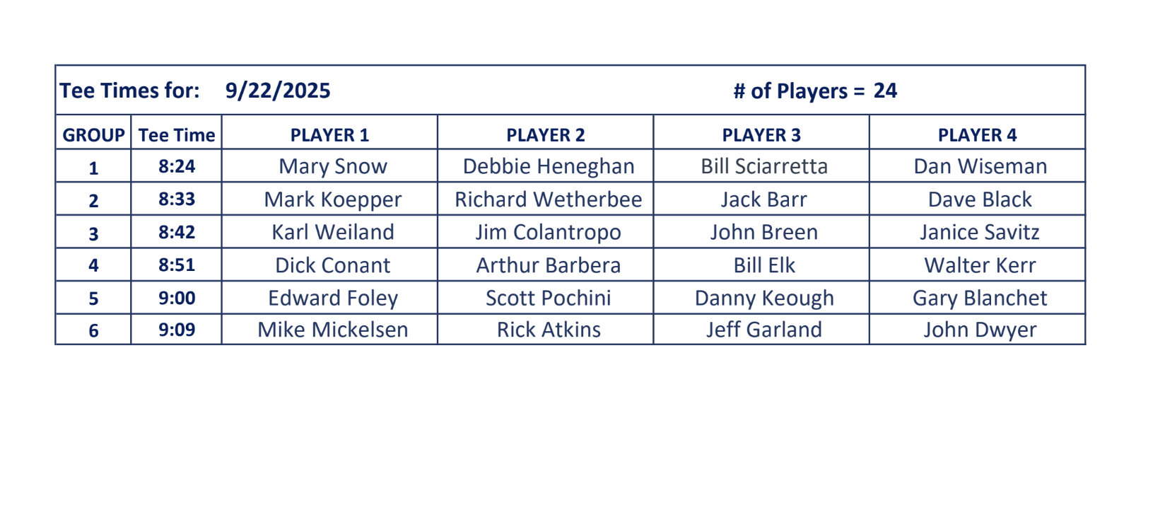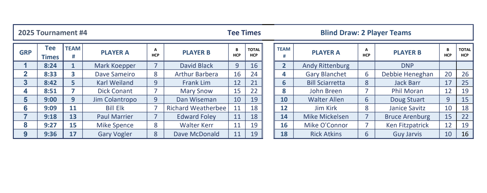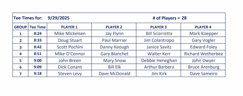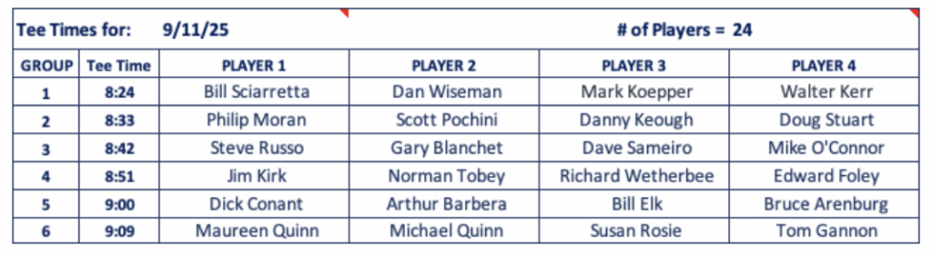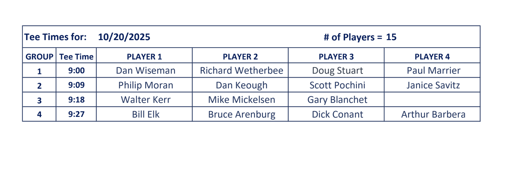 2025-10-06 Tee Times for Oct 6 Tournament 6 – 4 Person Scramble