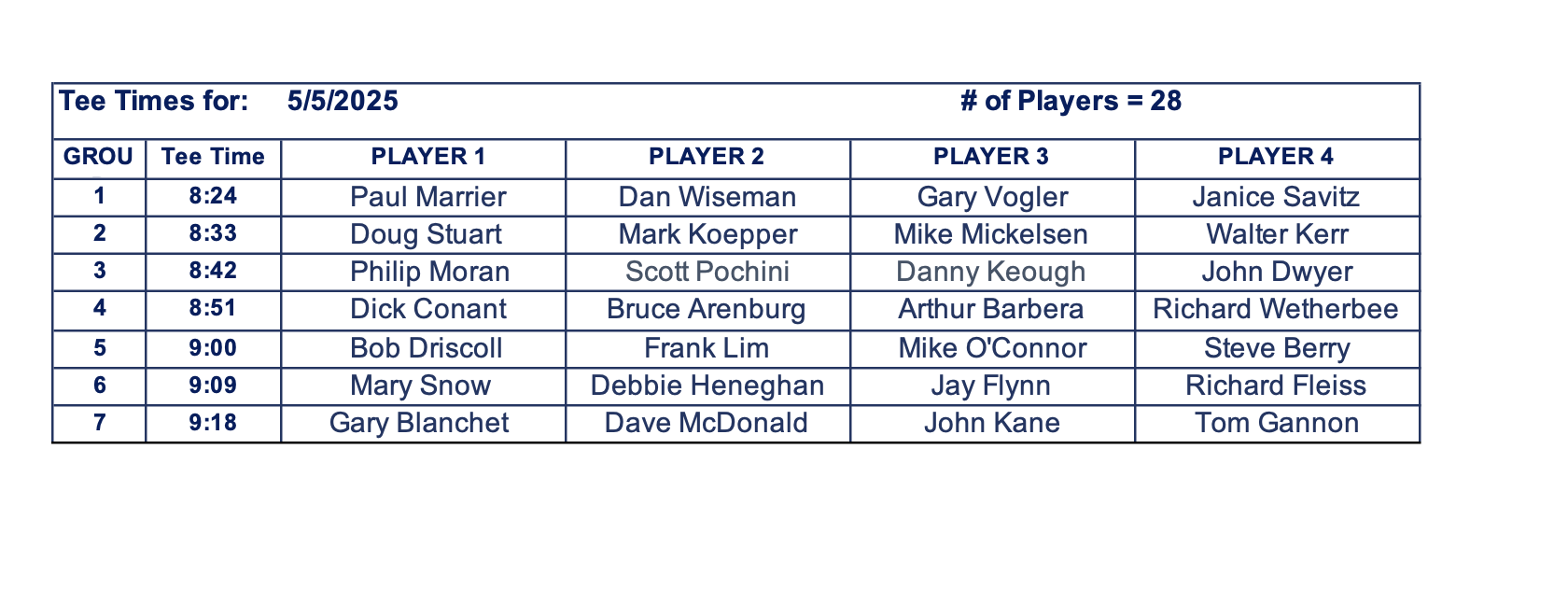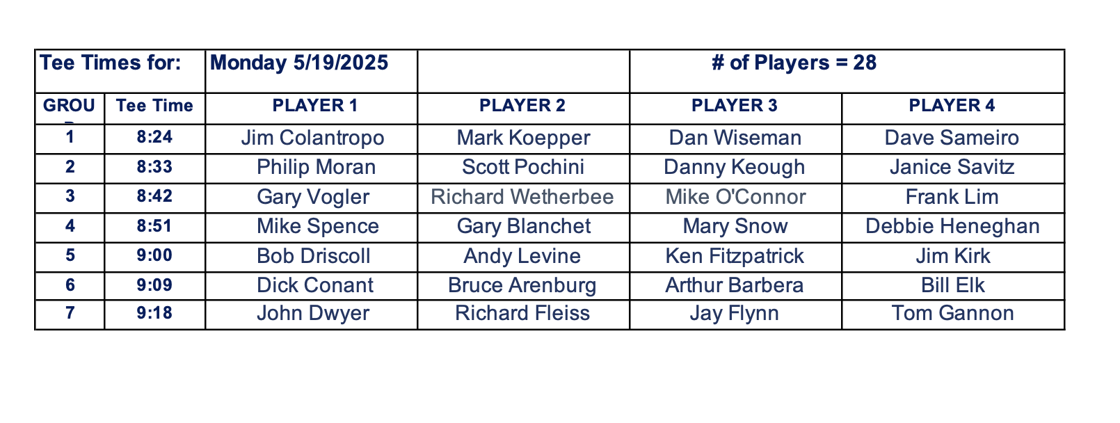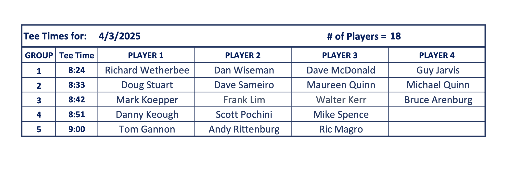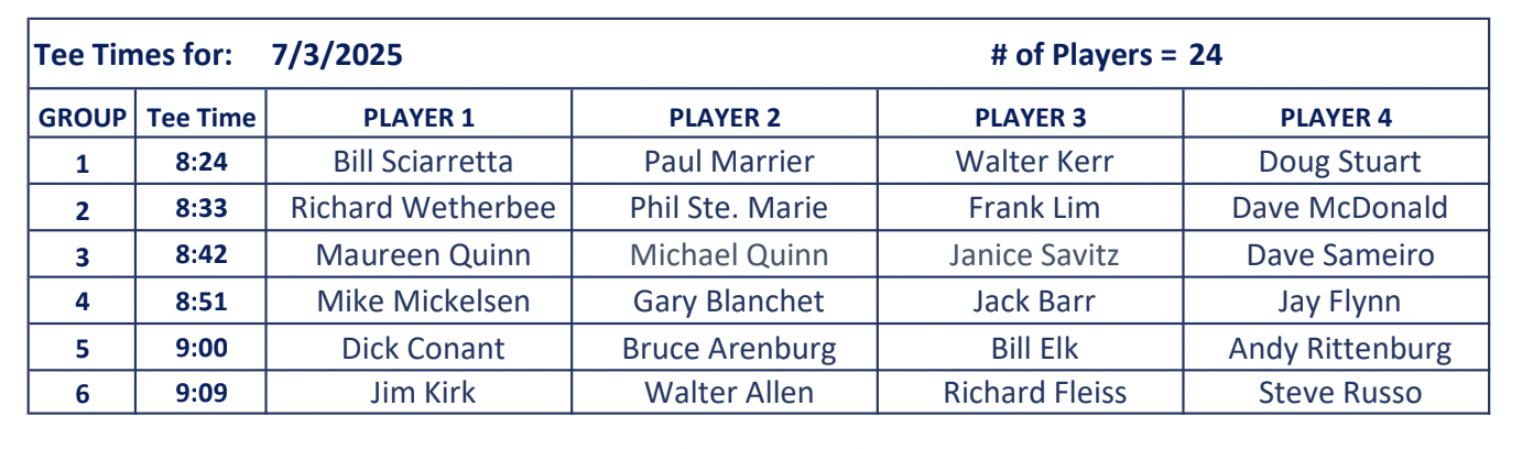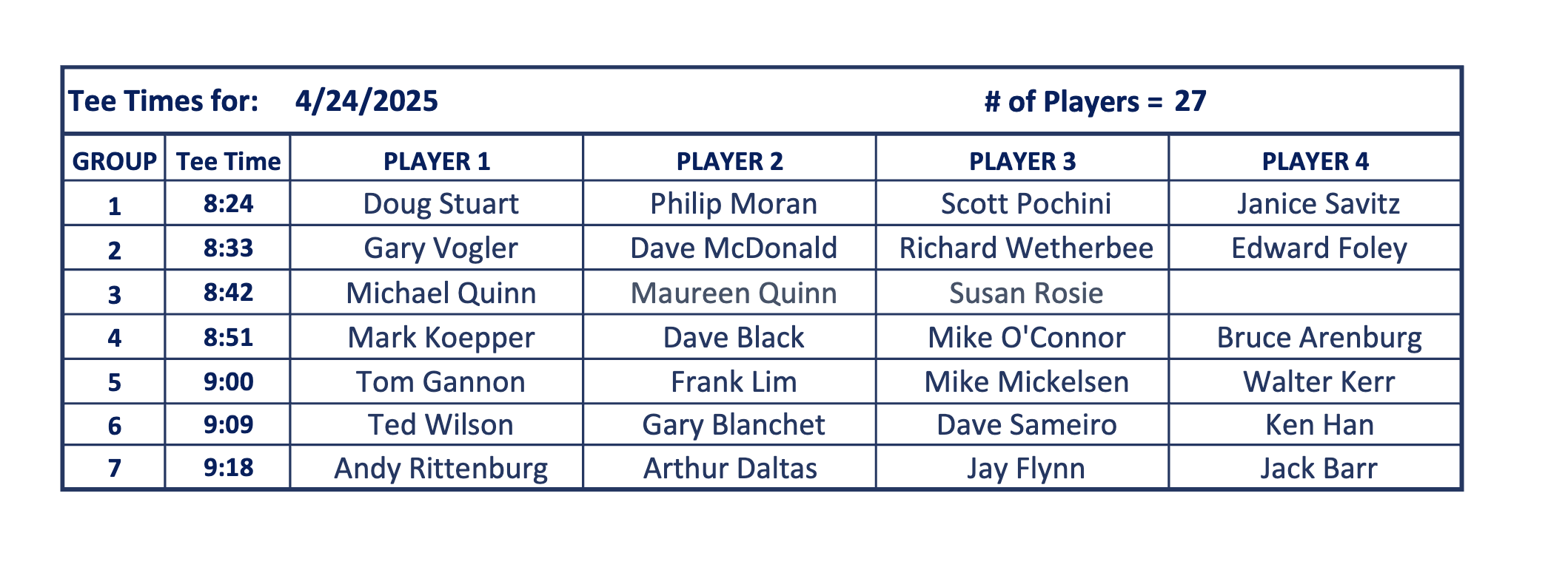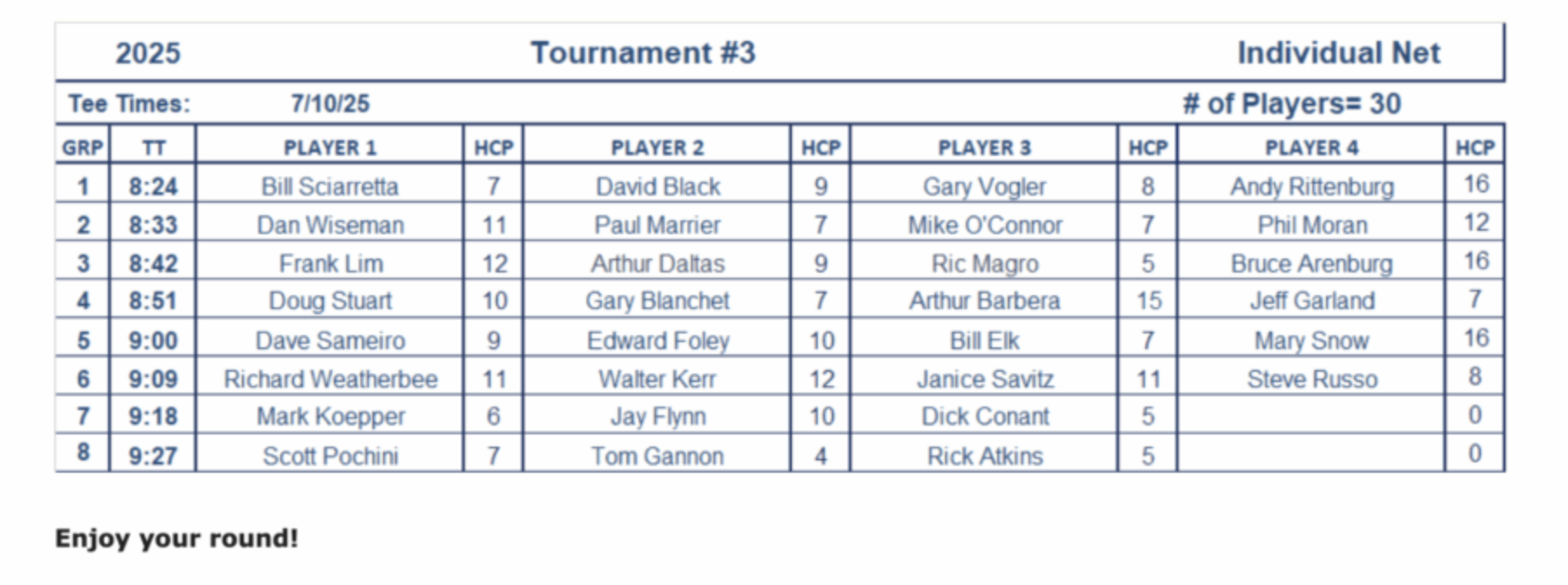 2025-10-06 Tee Times for Oct 6 Tournament 6 – 4 Person Scramble