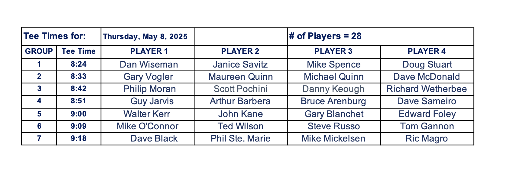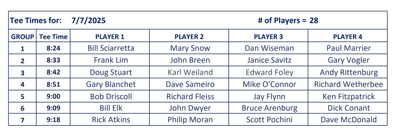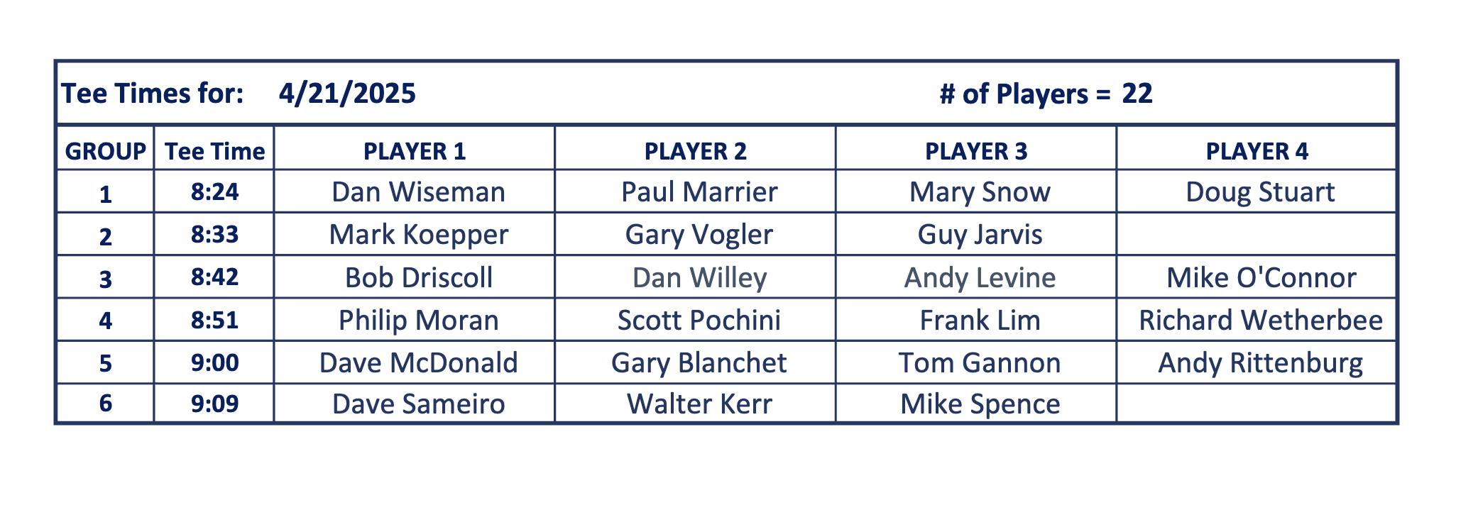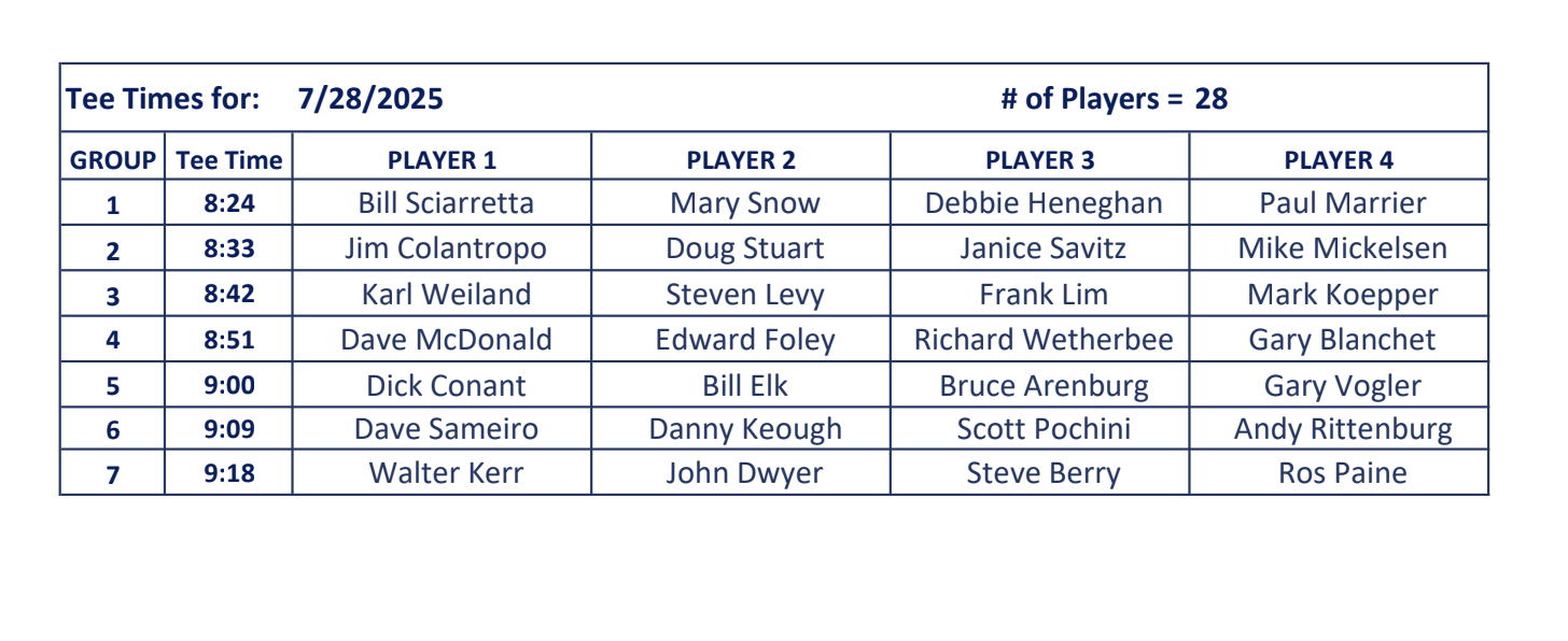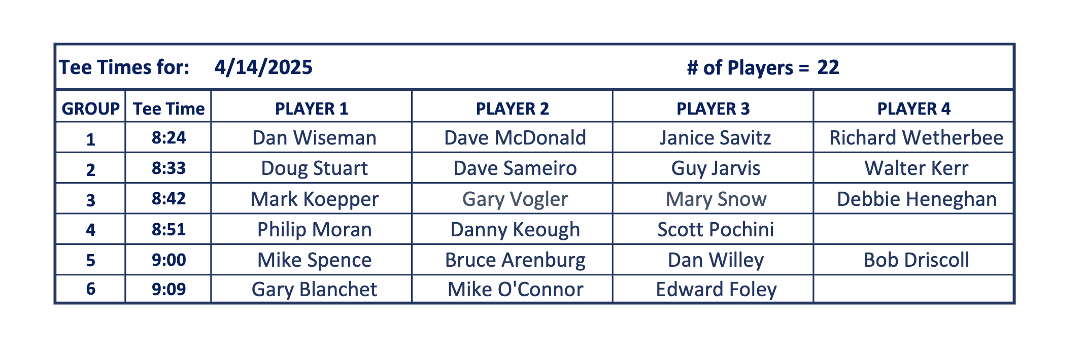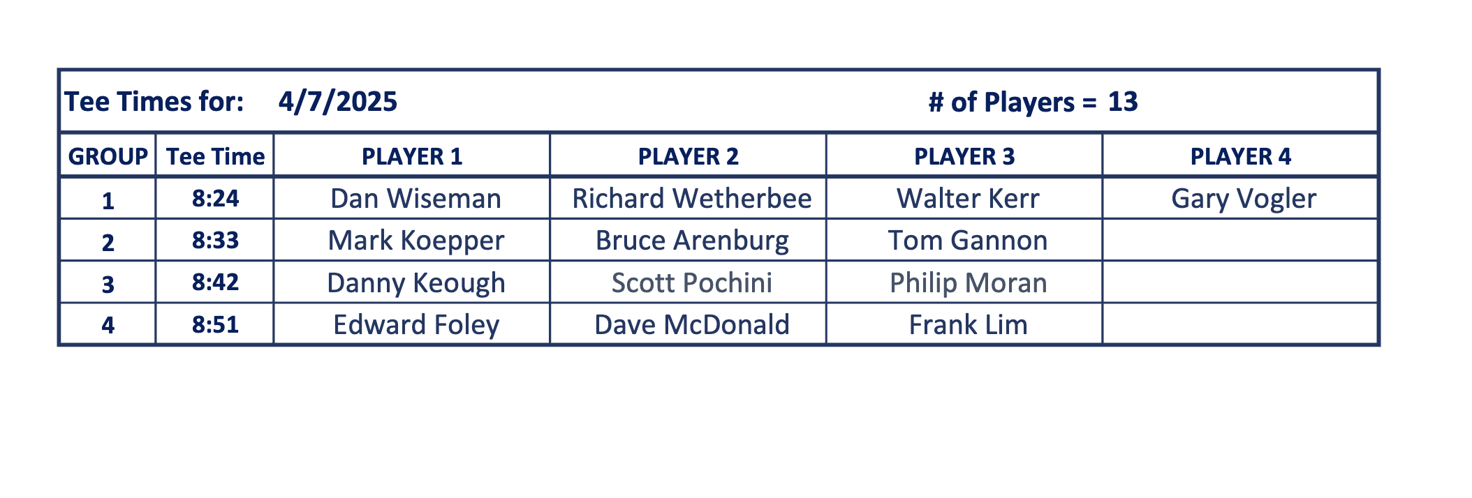 2025-10-06 Tee Times for Oct 6 Tournament 6 – 4 Person Scramble